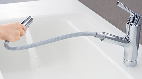 浄水器内蔵や引き出しシャワー、自動温度調節付き水栓などが人気です。